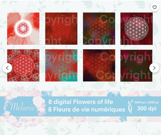 Dans mes créations, je combine la Fleur de Vie – symbole de géométrie sacrée et d’harmonie universelle – avec des affirmations positives puissantes.