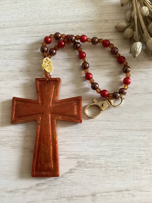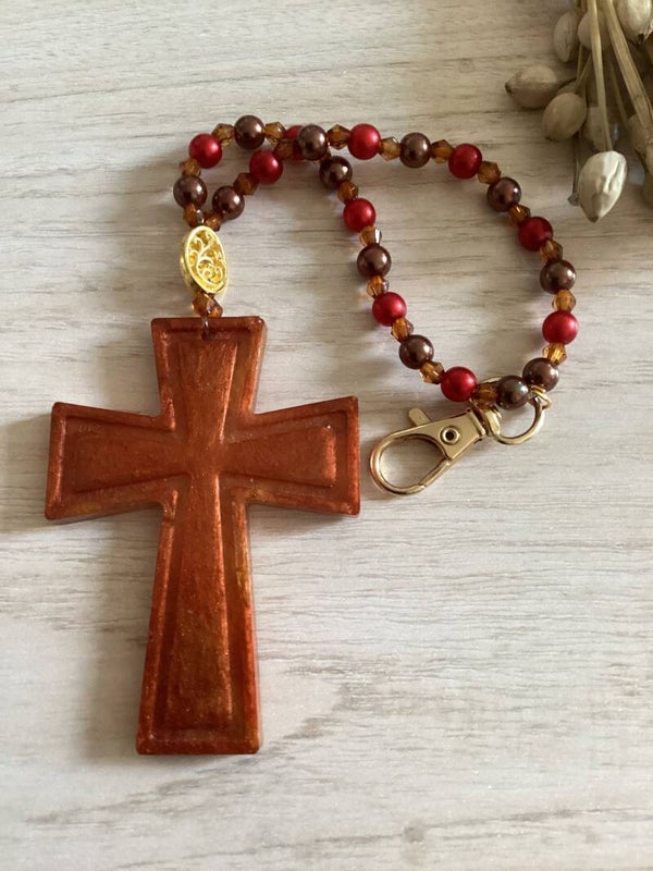 Porte-clés croix en résine – Bijou de sac spirituel avec perles rouges | Cadeau de Noël bienveillant | Protection & douceur