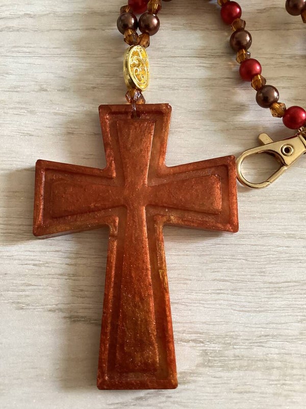 La croix est en résine, aux reflets chaleureux, accompagnée d’un petit chapelet de perles rouges.