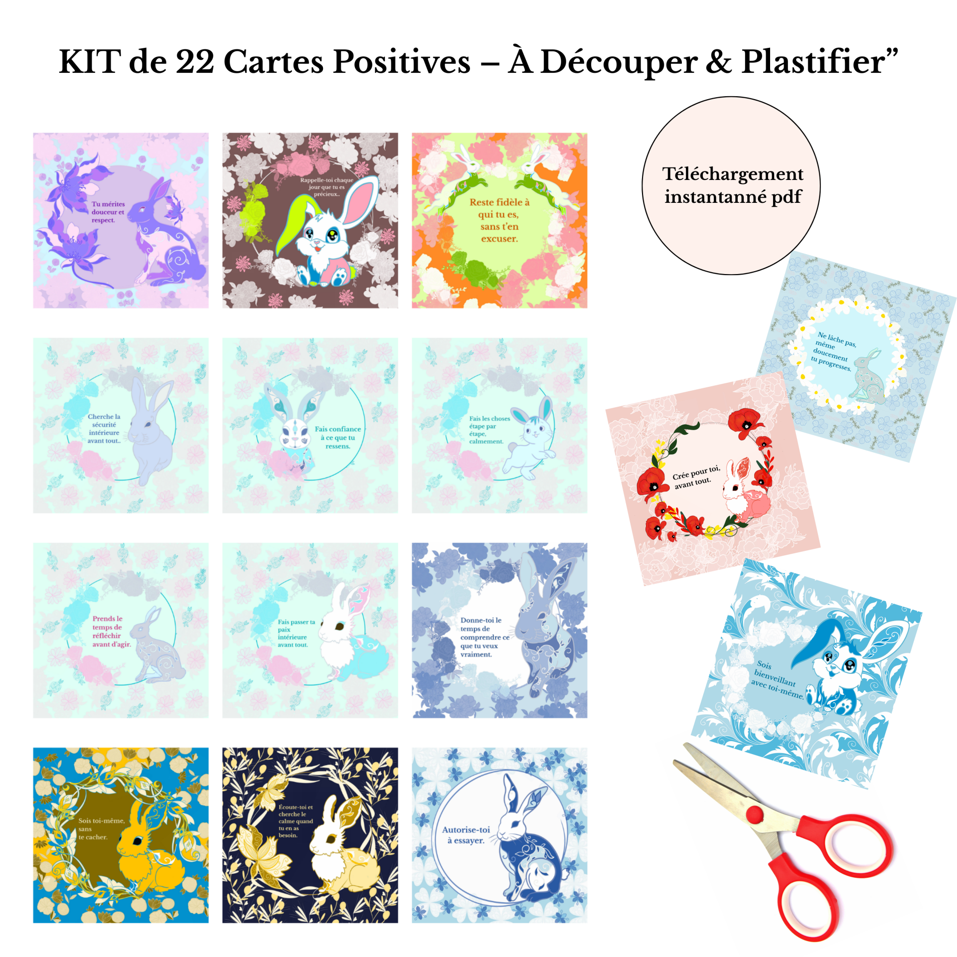 🌸 KIT DE 22 AFFIRMATIONS POSITIVES du lapin À télécharger - à imprimer – à découper – plastifier
