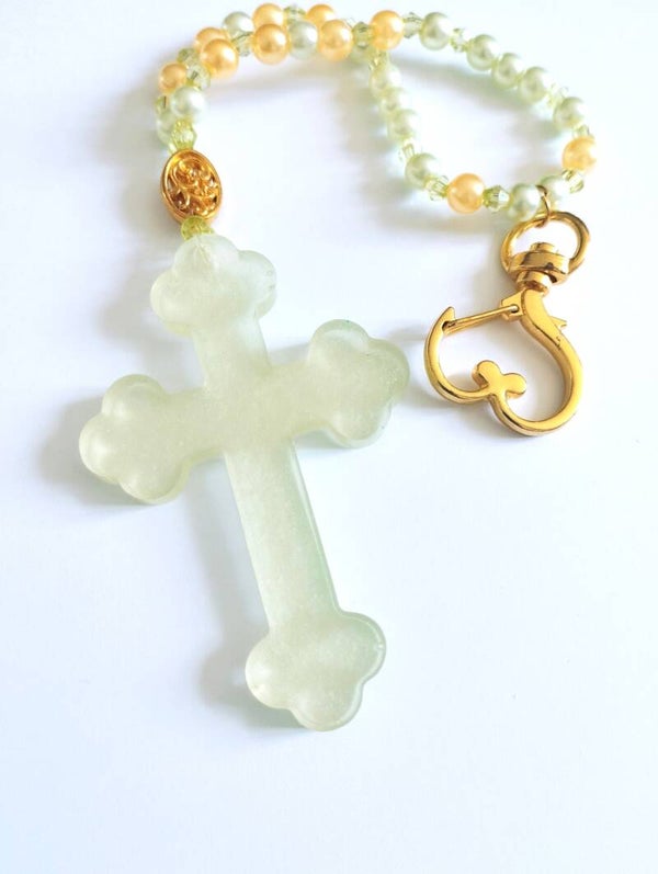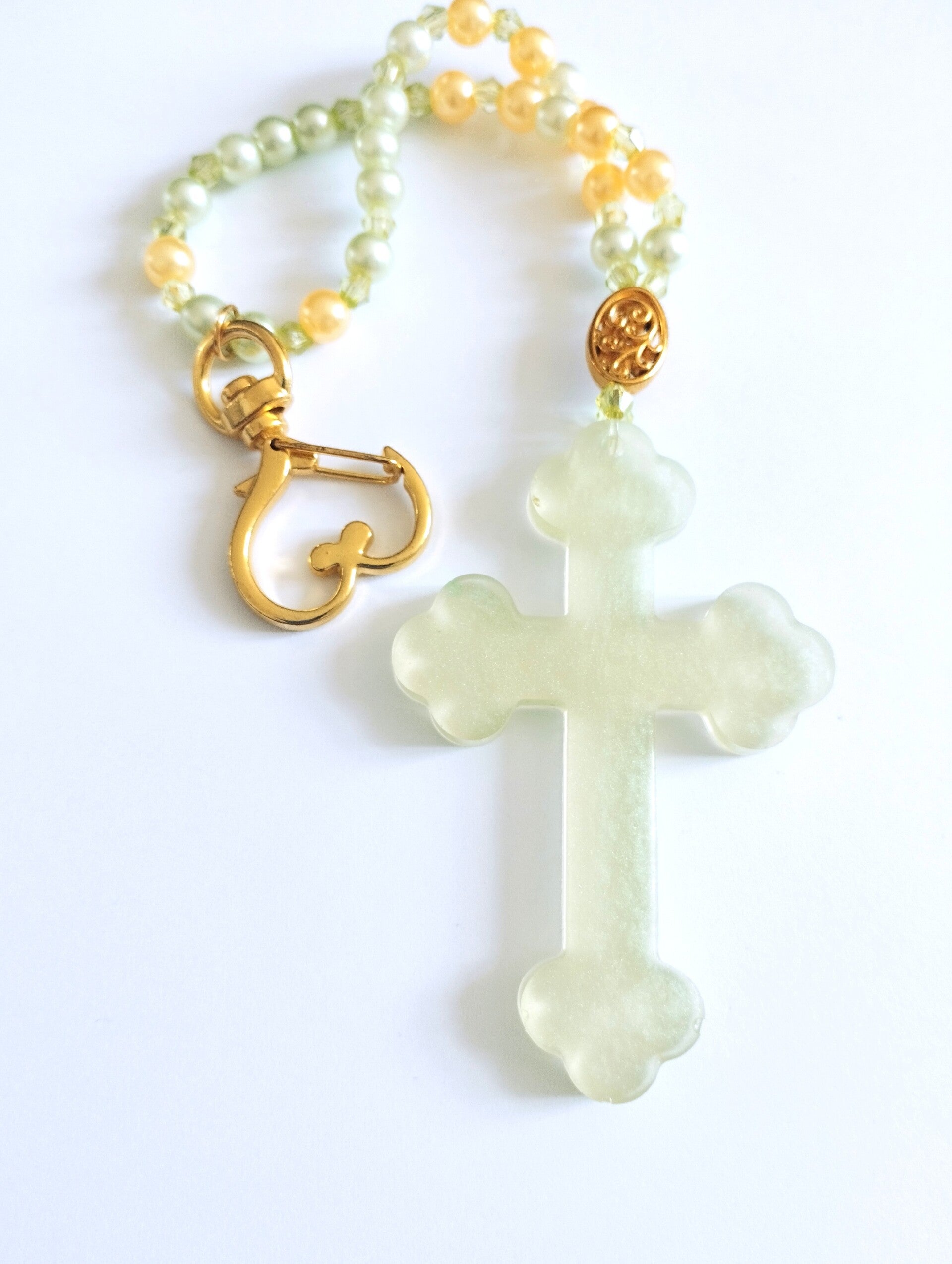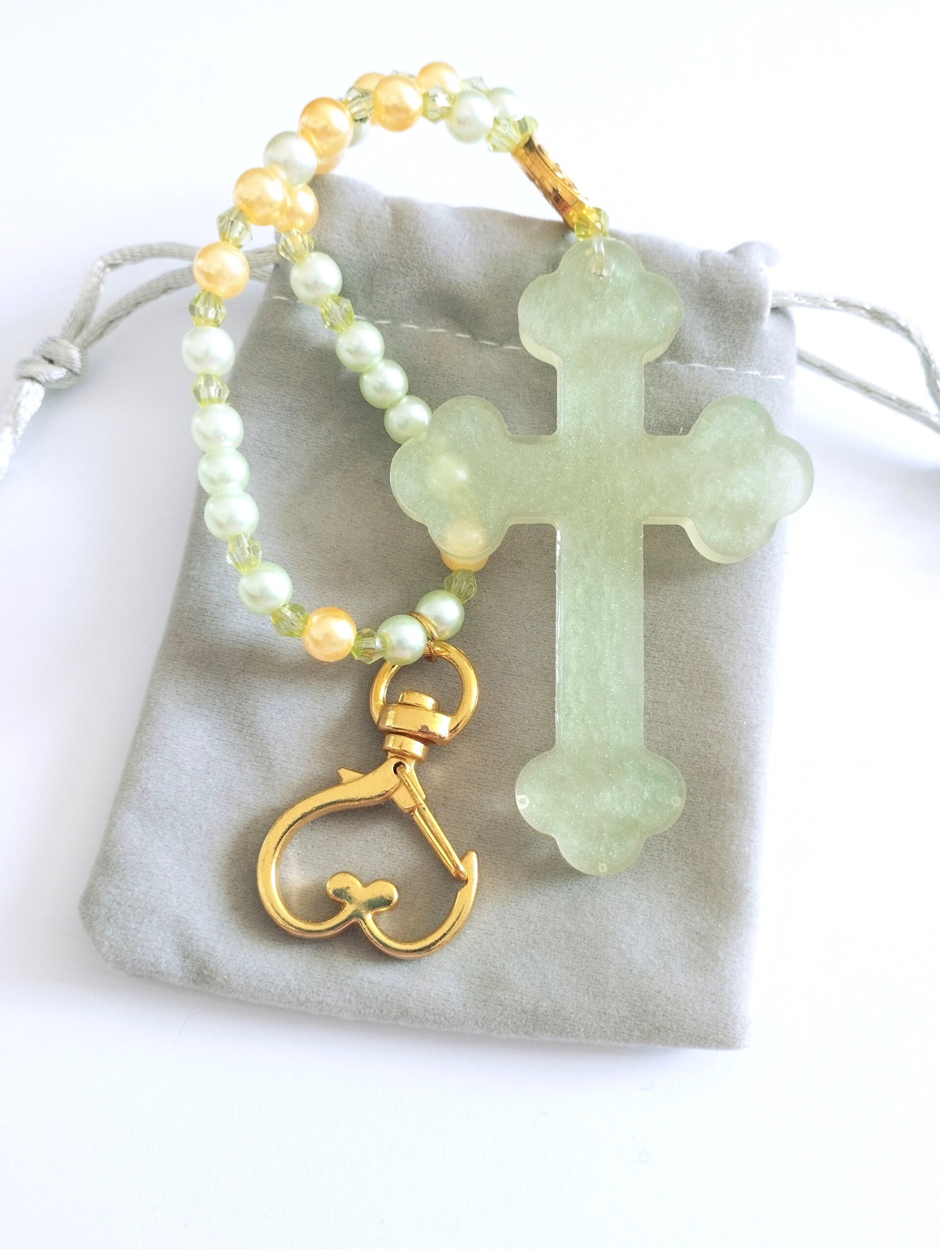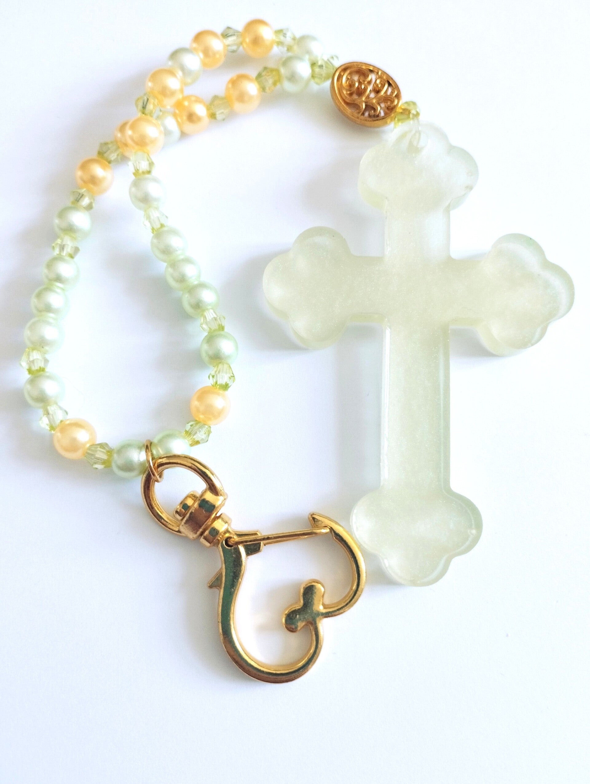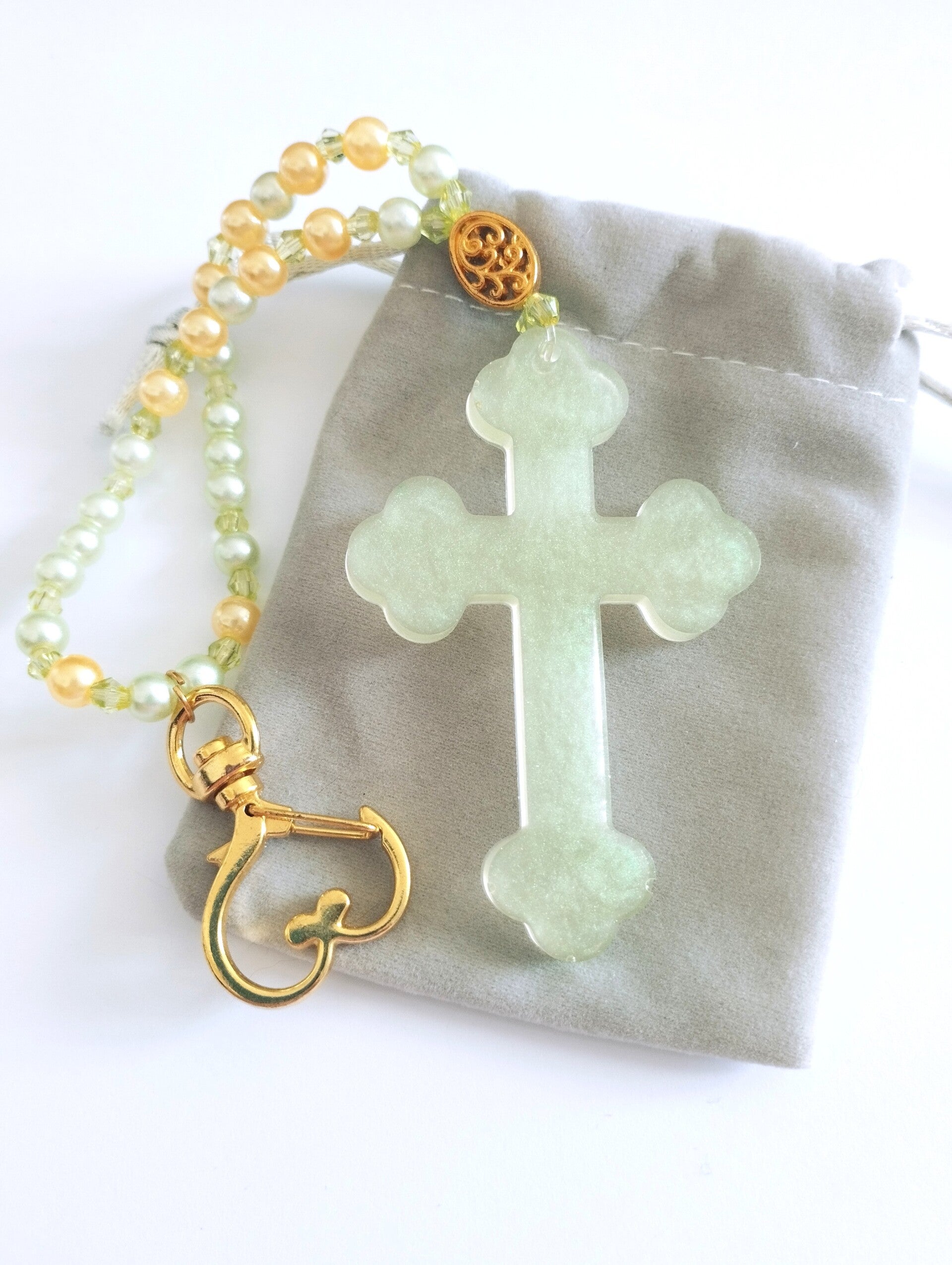 ✨ Détail : croix en résine vert clair, perles lumineuses, attache pratique
