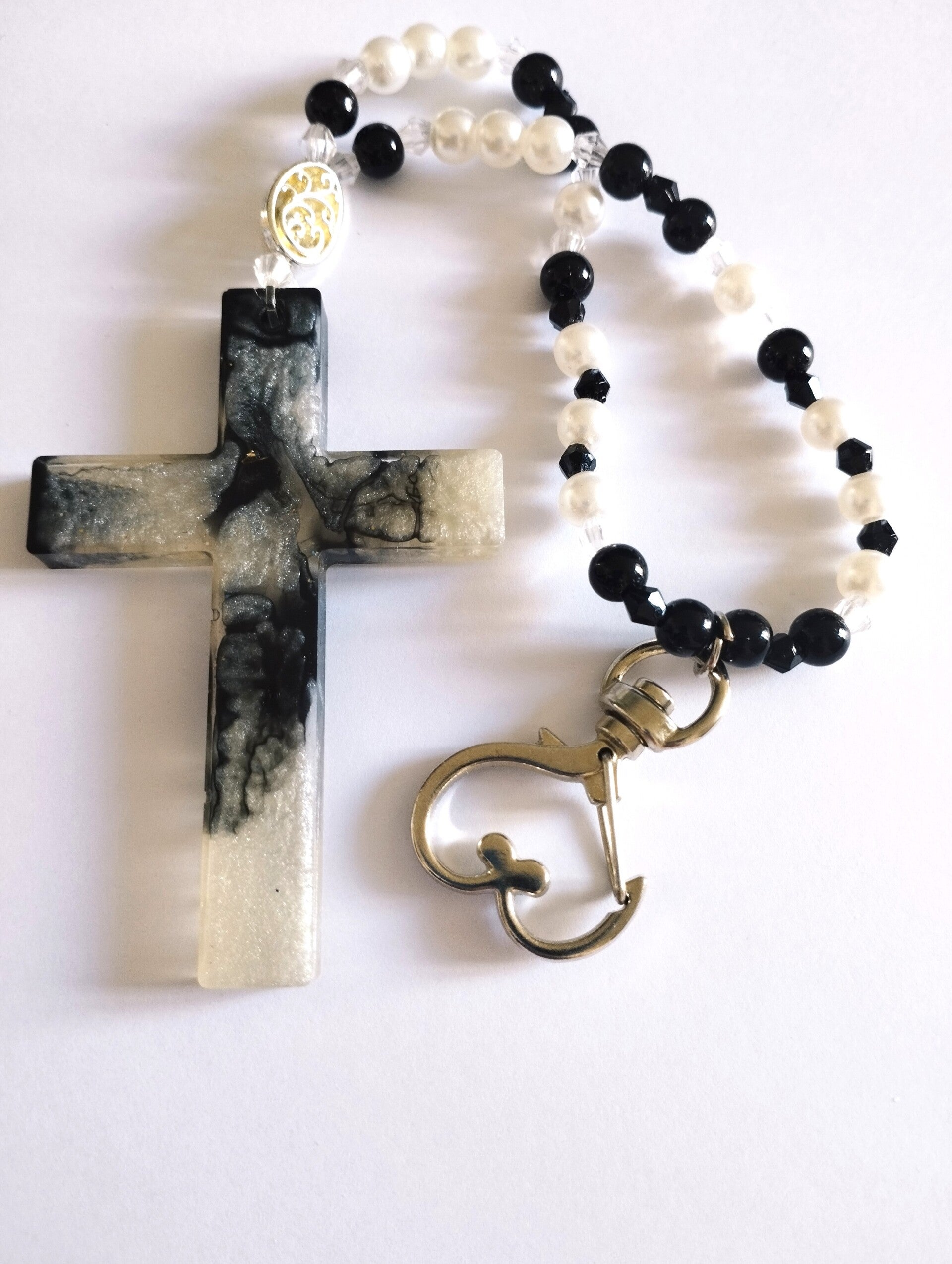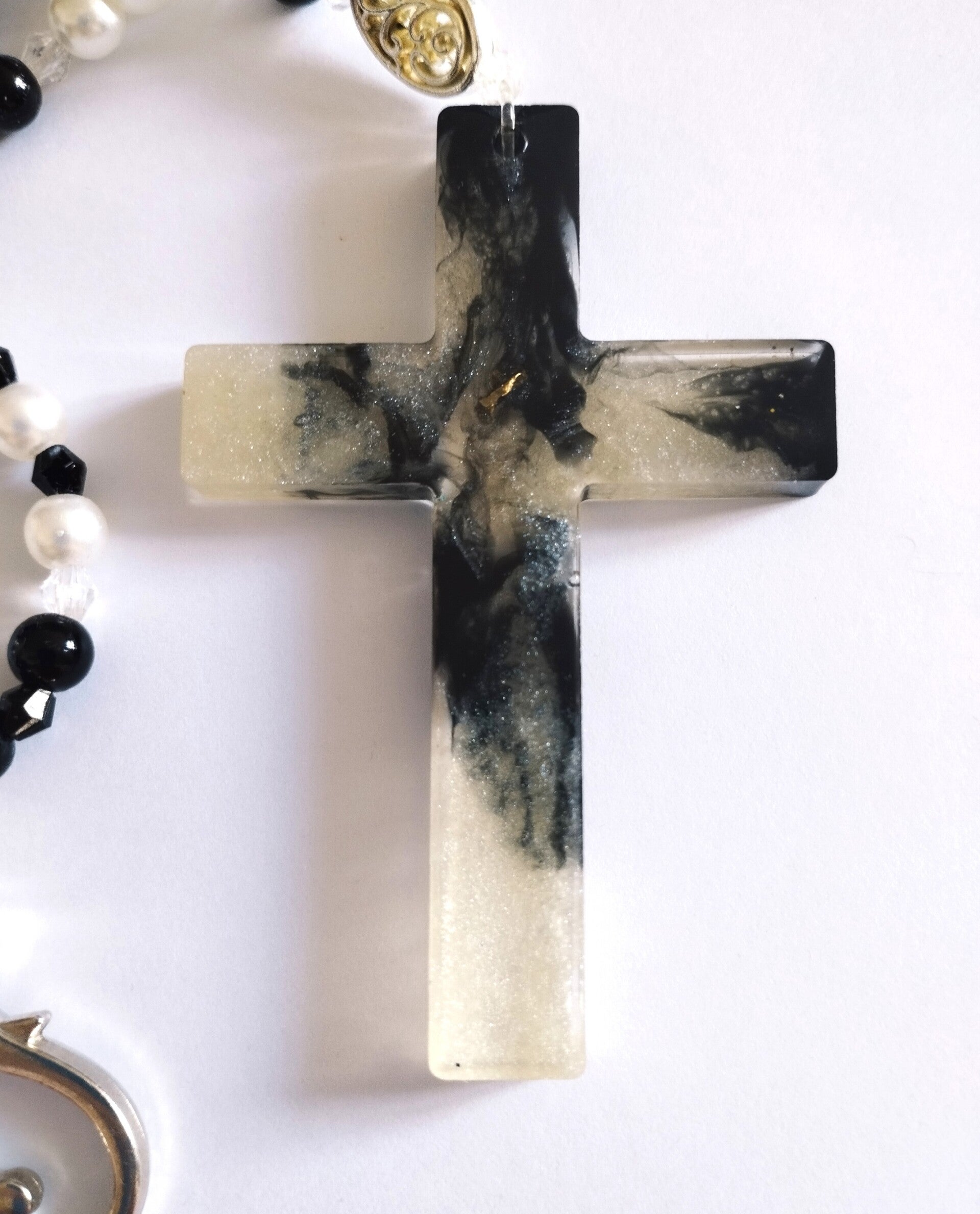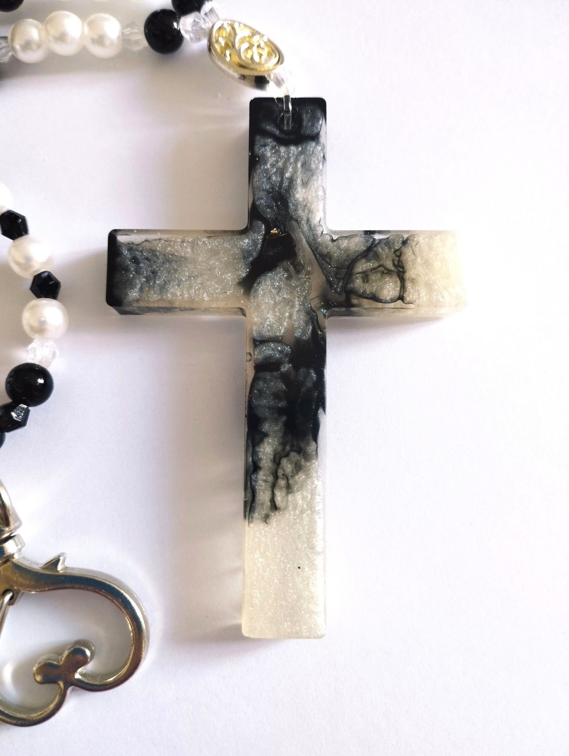 ✨ Détail : croix en résine marbrée, perles noires et blanches, attache pratique