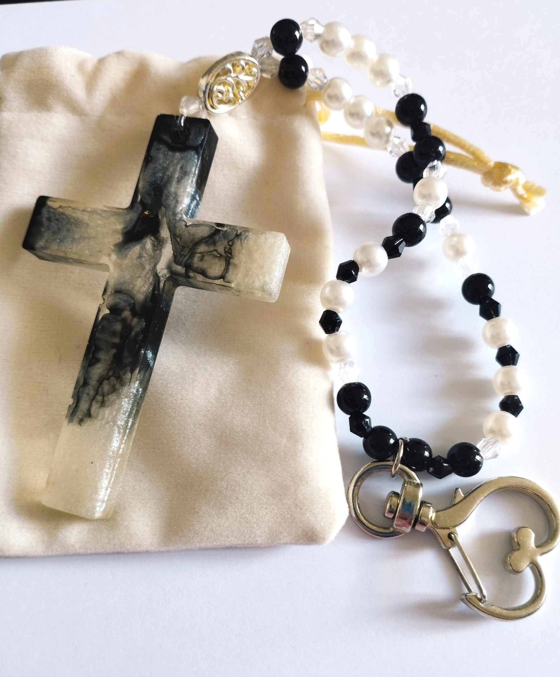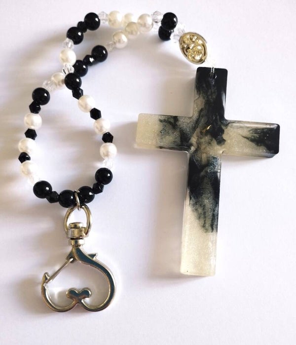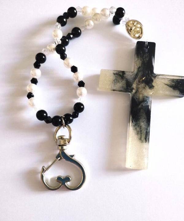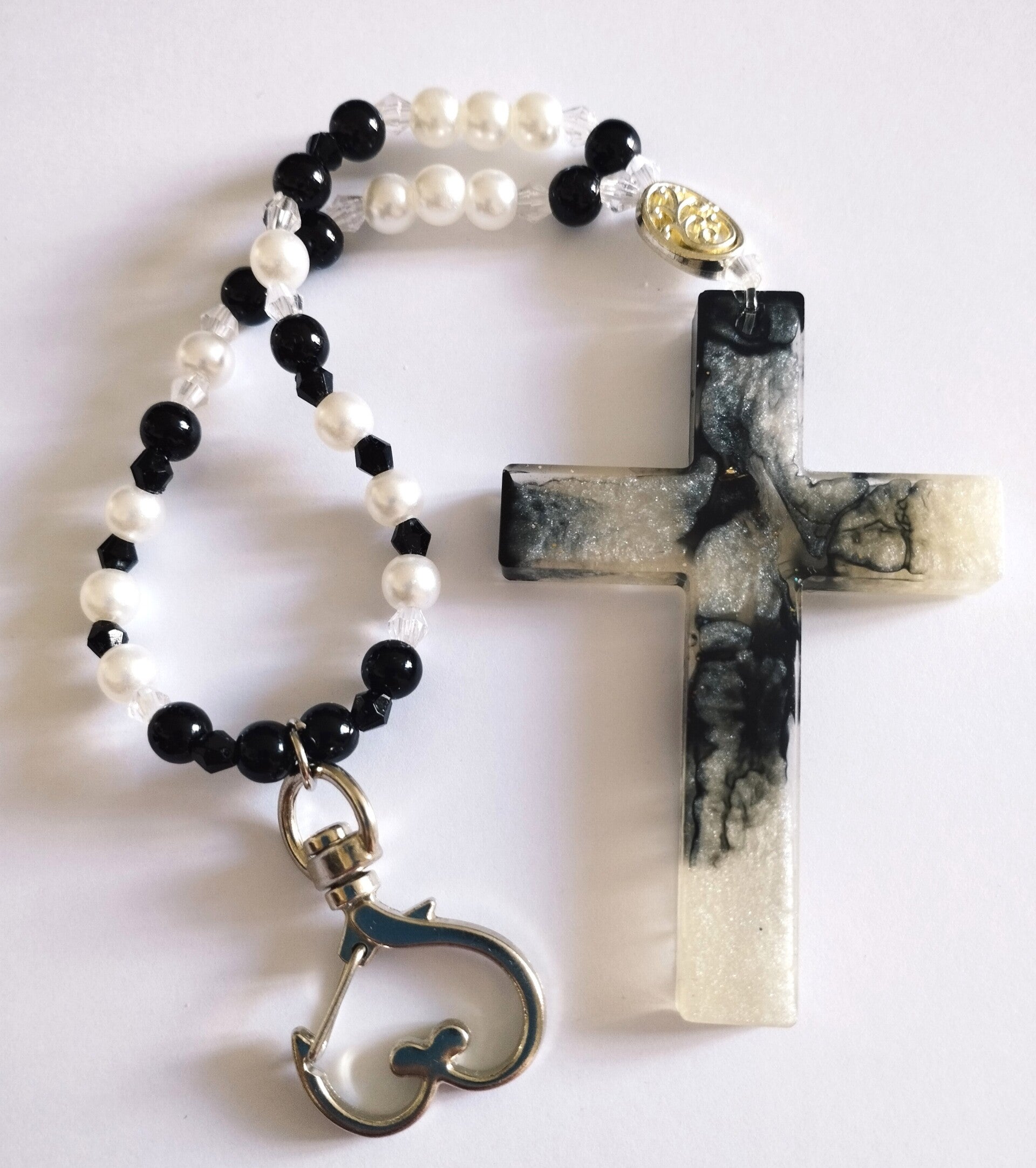 ✨ Détail : croix en résine marbrée, perles noires et blanches, attache pratique
